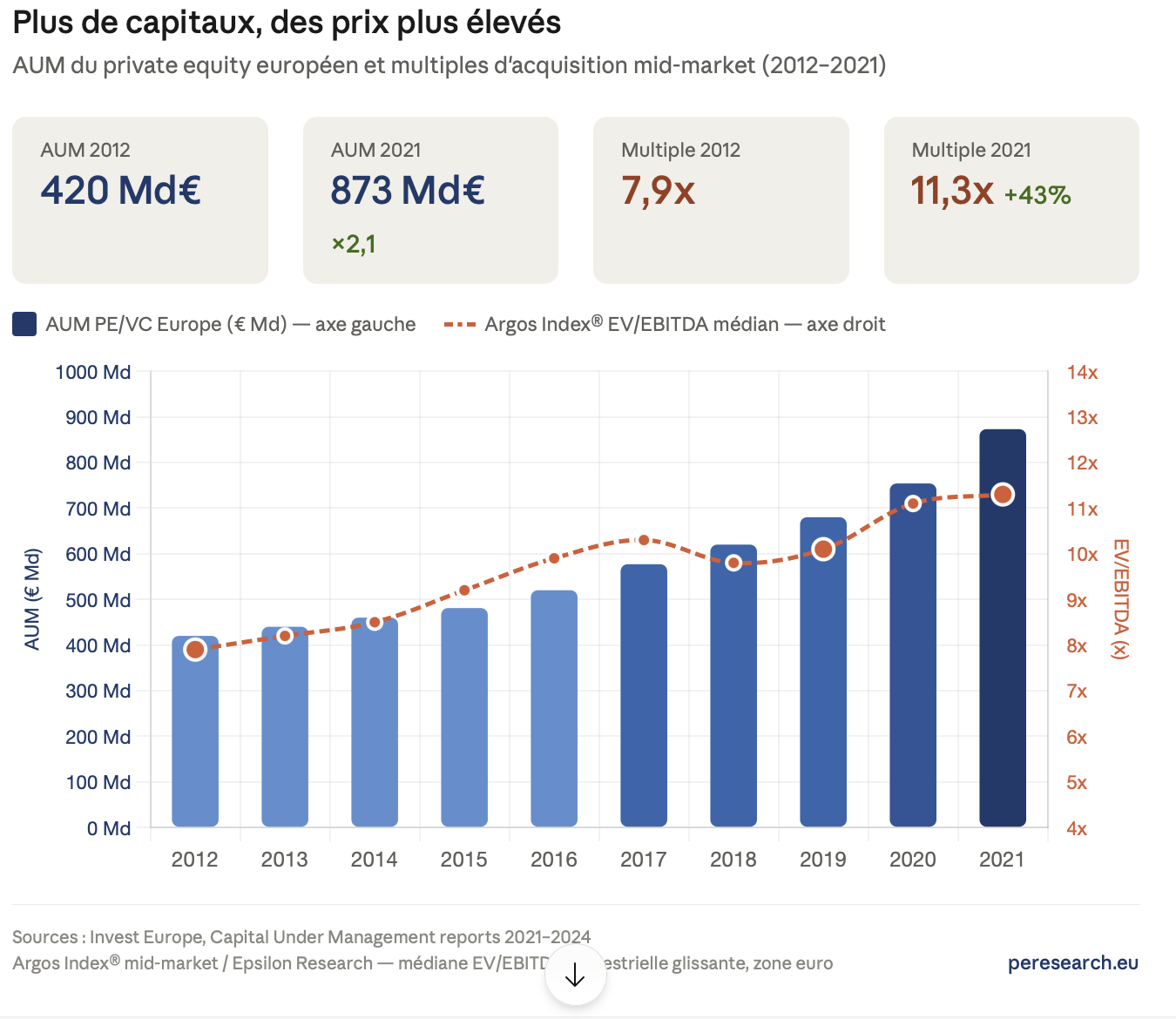 Mécaniquement, les GP avec plus de capitaux à déployer ont dû payer plus cher pour accéder aux mêmes cibles. La hausse des multiples n’est donc pas une anomalie de marché — c’est l’expression arithmétique d’un déséquilibre offre/demande structurel de capitaux.